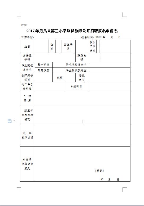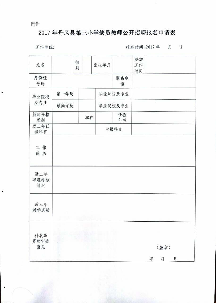 2017年丹鳳縣第三小學缺員教師公開招聘報名申請表