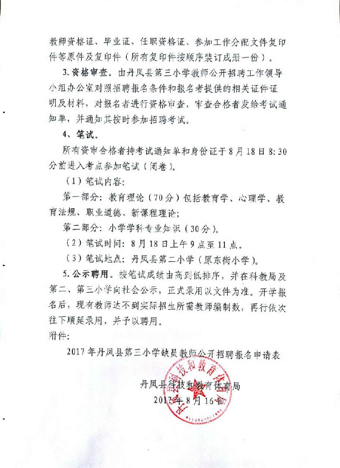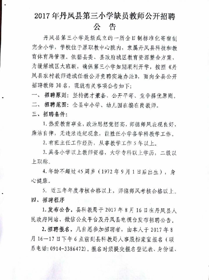 1.發布公告。縣科教局于2017年8月16日在丹鳳縣人民政府網站、微信公眾平臺及丹鳳縣電視臺發布招聘公告。