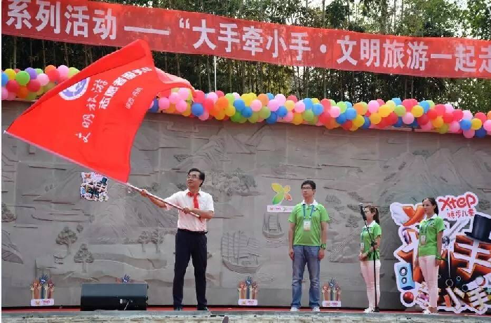 當天上午,鞠萍姐姐帶領文明旅游志愿者、媒體記者、公益人士、少兒代表一起參加了“大手牽小手?文明旅游一起走”綠手帕公益行動,志愿者現場發放綠手帕,舉行了綠色騎行、撿拾垃圾、參觀桃花谷水保科普展等活動。